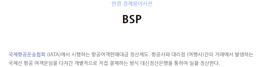 국내 여행사 순위로 리스트를 만들 때 자주 언급되는 용어가 BSP이며 그 사전적 의미는 다음과 같습니다.
