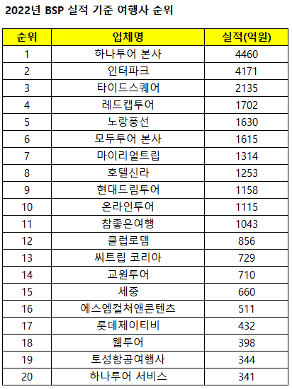 2022년 기준으로 국내 여행사의 순위는 아래와 같으며 2022년 BSP 기준 총 발권 실적은 약 2조 9000억원으로 집계되어 있습니다.