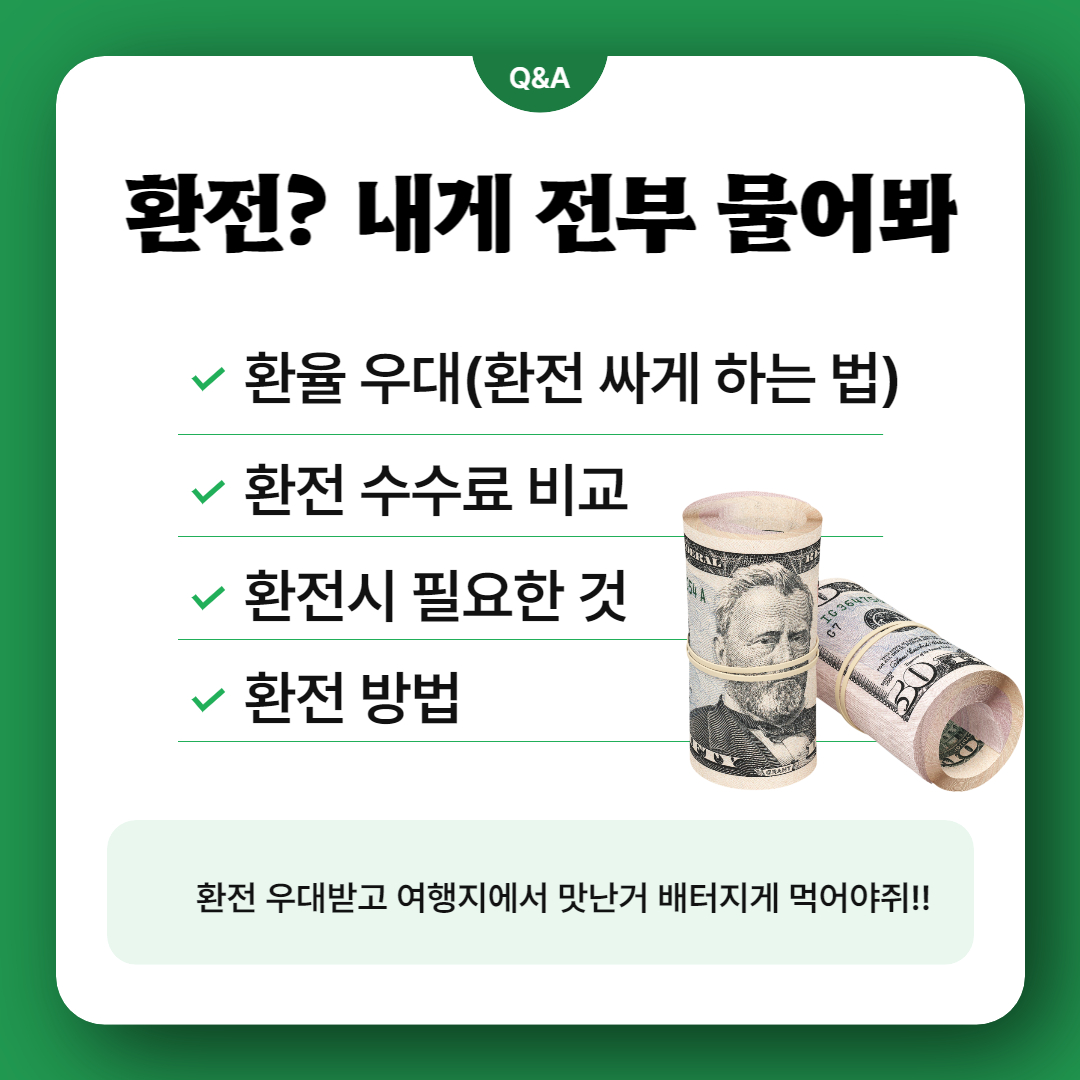 그럼 당연히 환전 우대받는 법, 환전 수수료 줄이는 법, 환전시 필요한 것, 환전에 유리한 은행 등을 알아봐야겠죠?