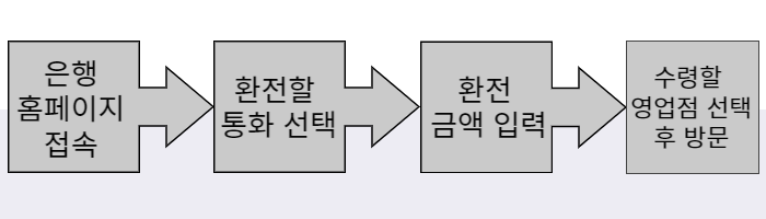 은행 홈페이지 접속 → 환전할 통화 선택 → 환전할 금액 입력 → 수령할 영업점 선택 → 해당 영업점 방문
